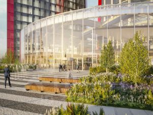 Эксклюзивные дизайнерские элементы: собственное лобби от студии Yorgo Lykouria, свыше 5,5 тысяч световых панелей, итальянская мраморная облицовка арабескато и стеклянный атриум высотой восемь этажей.