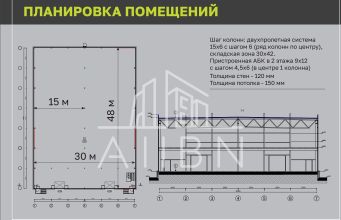 - Шаг колонн - двухпролетная система 15х2 с шагом 6 (ряд колонн по центру), складская зона 30х42. Пристроенная АБК в 2 этажа 9х12 с шагом 4,5х6 (в центре 1 колонна)