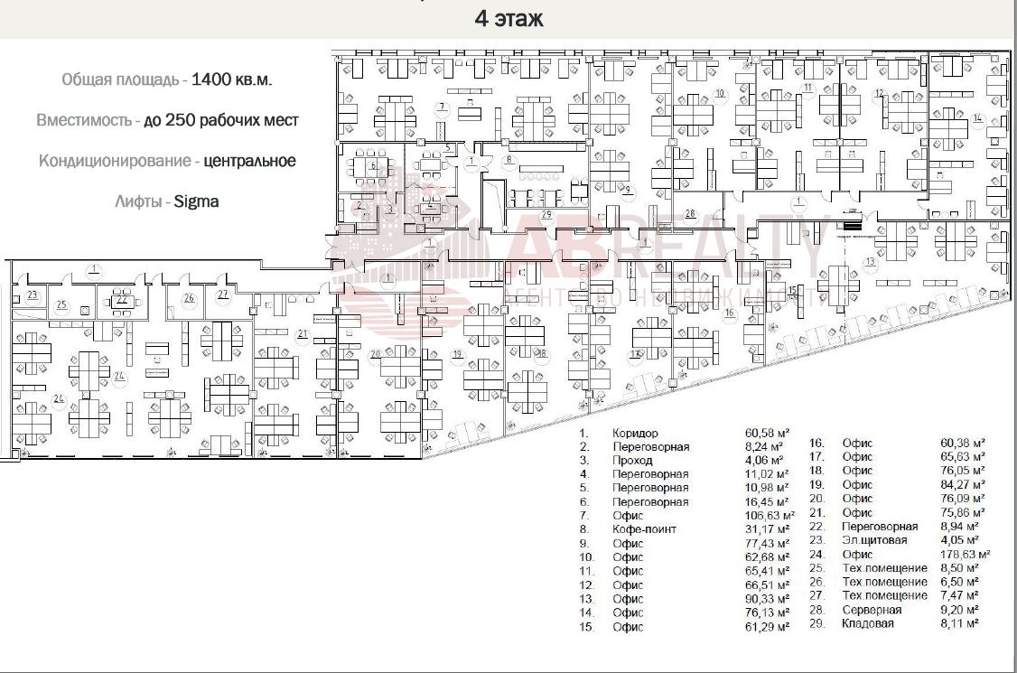 Смешанная планировка, переговорные, кофе-поинт, серверная и тд.
