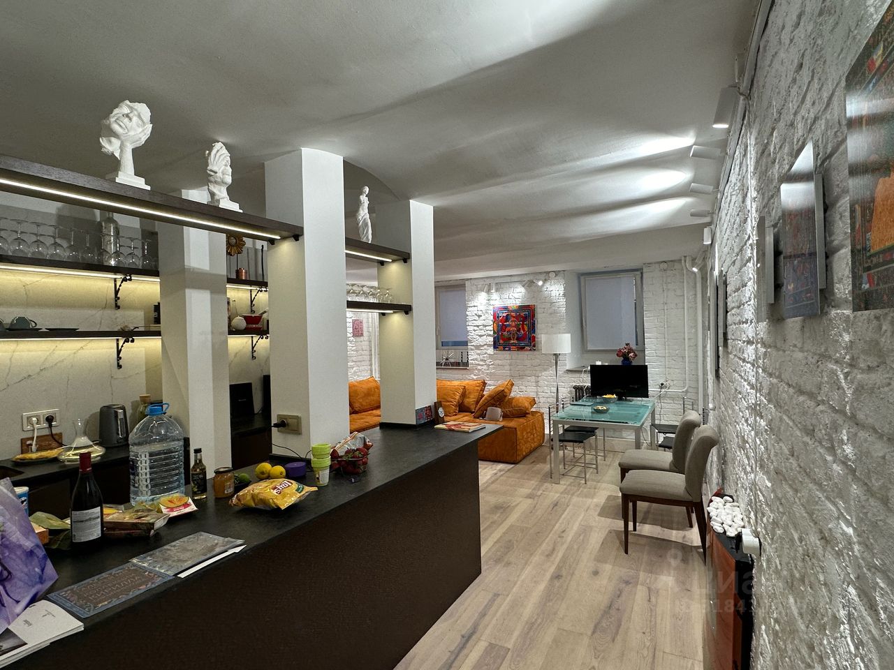 Светлый полуподвал с 4 окнами. Барная стойка с кухней