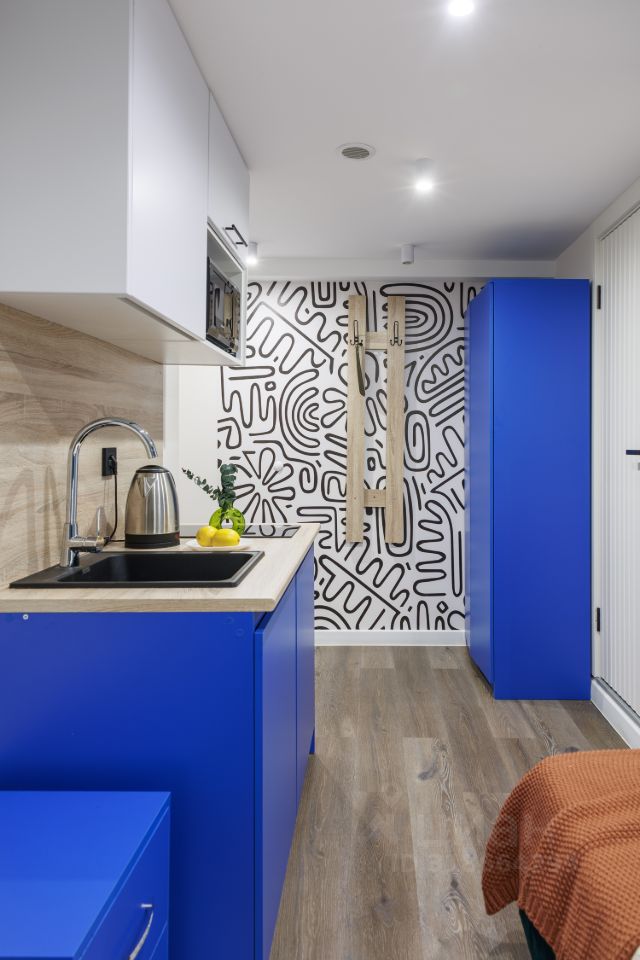 • Полноценная встроенная кухня: варочная панель на 2 конфорки, СВЧ, холодильник, кухонная утварь и посуда