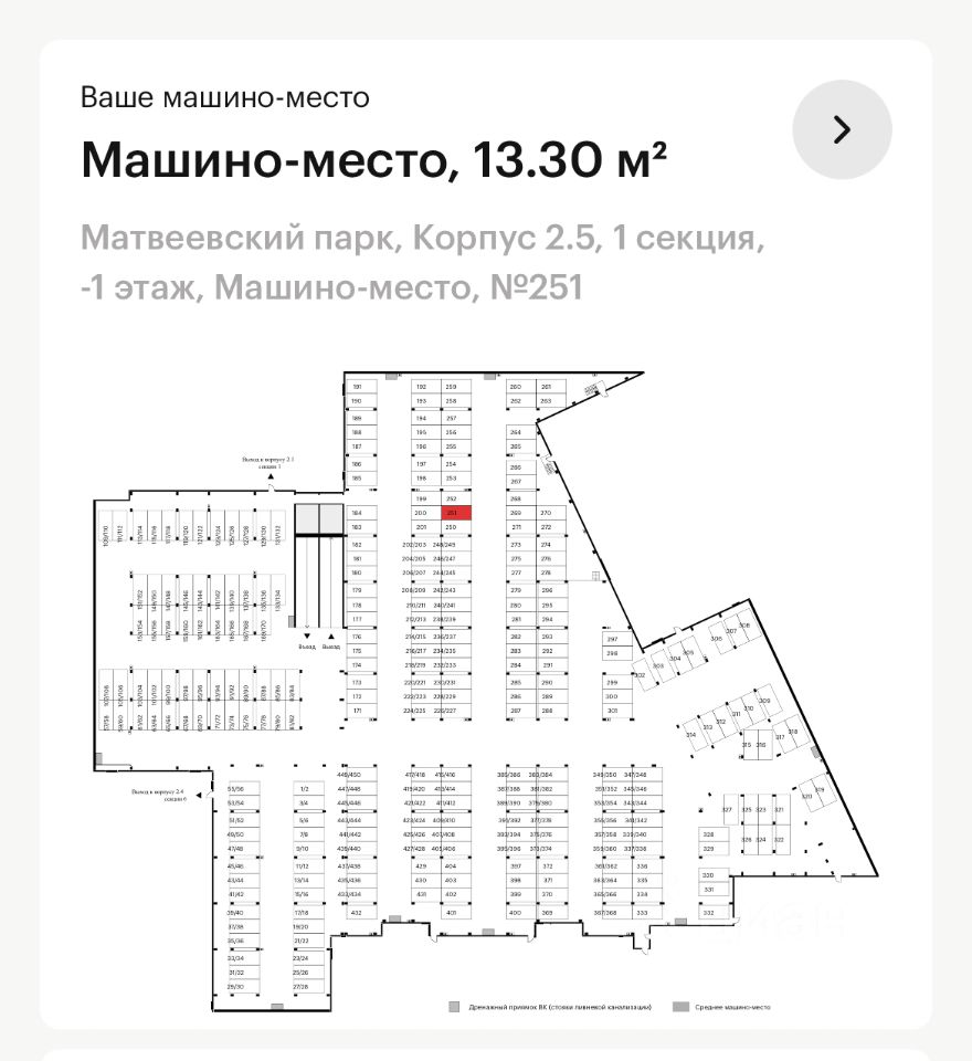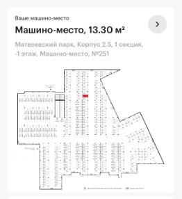Продается машиноместо 251, рядом с входом в корпус 2.2. машиноместо в собственности, не под ипотекой и не под залогом.