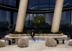 Пространства лобби обладают двусветной структурой, площадью до 500 кв. м, высотой потолков 8 м и витражным остеклением, что обеспечивает высокую степень естественного освещения.