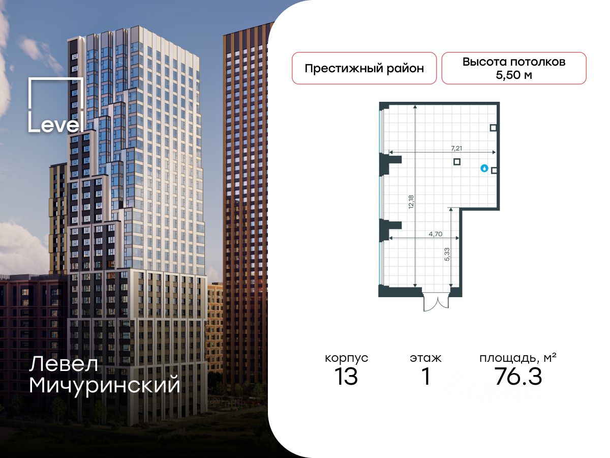 Продается помещение свободного назначения 76.30 кв.м. в проекте бизнес-класса Левел Мичуринский по адресу: Озерная улица, дом 1А. Помещение расположено на 1 линии улицы с высоким автомобильным и пешеходным трафиком в престижном Западном районе Москвы. Ликвидная площадь обеспечит высокую рентабельность вложений. Большие витрины высотой более 4 метров наполнят помещение естественным светом и предоставят широкие возможности для оформления рекламных поверхностей.