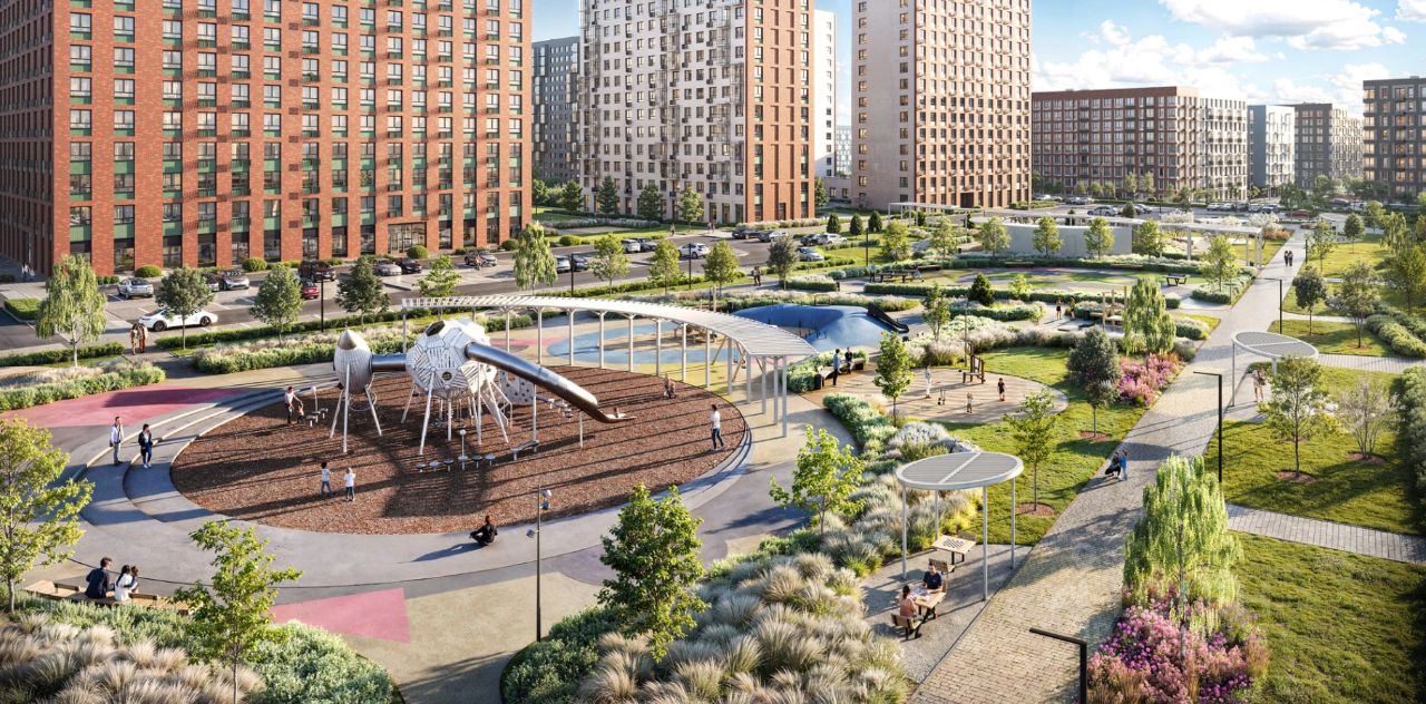 - напротив событийная площадь с детскими площадками и зонами отдыха;