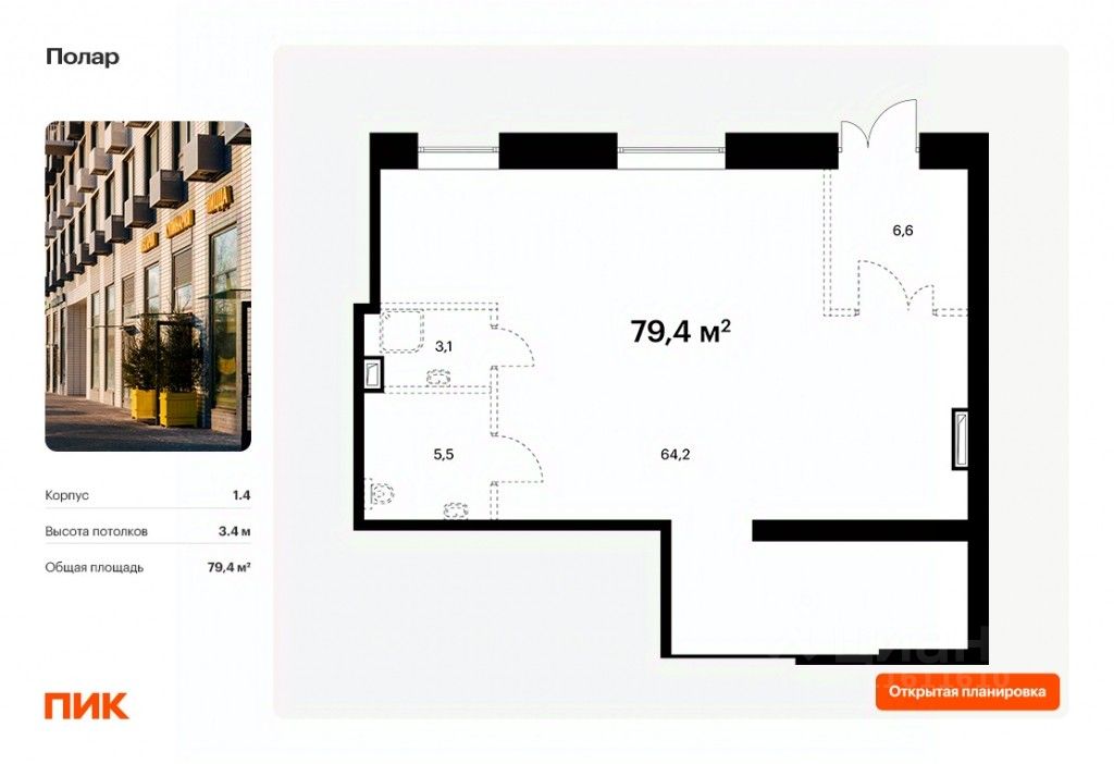 Продаётся нежилое помещение свободного назначения в новом жилом районе Полар от ПИК. Открытая планировка, витринное остекление, удобный вход на уровне земли. Помещение номер 4. Продажа напрямую от застройщика.