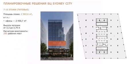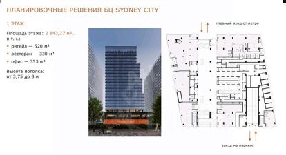 Лот 874829 Предложение от Собственника! Продажа Уникального БЦ Sydney City (А класс) в центре "Большой Сити" и Шелепихинской набережной. Метро и МЦК "Шелепиха" (15 мин пешком), а с 2026 г. до м.Звенигородская (1 мин пешком). Транспортная доступность: Звенигородское шоссе — 750 м, ТТК — 3,2 км, Садовое кольцо — 7 км, СЗХ — 2,4 км, МКАД — 10 км. Общая площадь — 75 105 м². Наземная площадь — 59 809 м². Офисы — 44 517,7 м². Ритейл — 516,1 м². Ресторан — 553,1 м². Эксплуатируемые террасы — 2 258 м². Столовая — 2 708 м². Подземный паркинг на 313 м/м и 12 мотомест. Отделка — shell&core. РНВ: 2 кв. 2025 г. АПП: 4 кв. 2025г. ХАРАКТЕРИСТИКИ ОФИСОВ: Панорамное остекление в пол. Шаг колонн 8,4 х 8,4 м. Энерговооруженность — 100 Вт/м². 5 отдельных лифтовых групп,