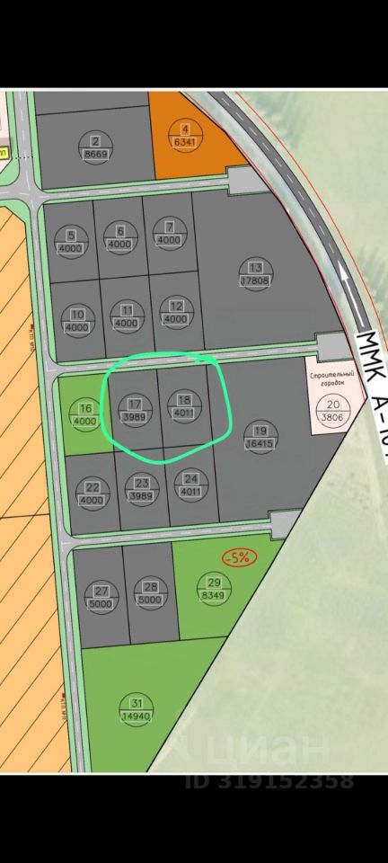 Продается участок 40 соток ( имеются ещё четыре смежных участка по 40 сот. на плане 17,18,22,23 и 24 участки). Расположен вблизи ЦКАД и имеет правильную, прямоугольную форму.