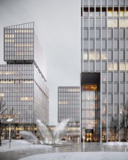 Три эффектные офисные башни соединены единым стилобатом, создавая гармоничное пространство с панорамным видом на город.