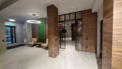 В холле дизайнерская отделка из шпона и колонны с деревянными панелями.