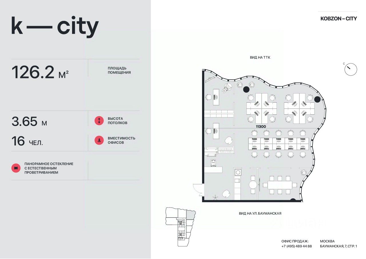 В едиственном проекте класса А на Бауманской K-CITY от Застройщика OCTOBER GROUP представлена широкая линейка офисов в продажу от 36 до 716 м2 с возможностью объединения. Офис 126 м2 - привлекальный вариант благодаря панорамному двухстороннему остеклению и потолками 3,65 м. Подходит для размещения на 15-17 человек. Уникальная особенность - волнообразный фасад от авторов проекта архбюро NIKKEN SEKKEI (топ-2 в мире).
