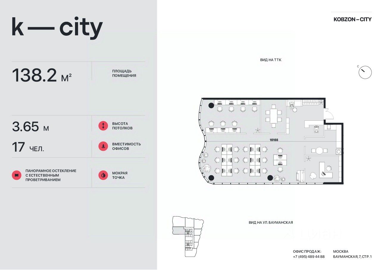 KOBZON CITY (K-CITY) - единственный БЦ класса А в локации Бауманской! Продажа офисов от застройщика. Удобная локация: 1 мин. до ТТК, рядом 2 станции метро (5 мин. до м. "Бауманская" пешком), в 10 мин. на машине площадь трех вокзалов и Садовое кольцо. Широкий выбор офисов от 36 до 716 м² с возможностью объединения до этажа целиком. Высокая инсоляция - потолки 3,65 м, панорамное остекление с естественным проветриванием. Современная инженерия, центральное кондиционирование и приточно-вытяжная вентиляция. Инфраструктура в бизнес-центре на 1-2 этажах (кафе, рестораны, магазины), столовая, артхаб, видовая терраса на крыше для резидентов, подземный паркинг. Строительная готовность в 4 квартале 2028 года. Рост стоимости к завершению проекта от 40%! В локации вакансия площадей составляет менее 5%, высокие ставки аренды от 45 тыс. руб./м2 в год. Рассрочка 0% с ПВ от 20% на срок до мая 2028!