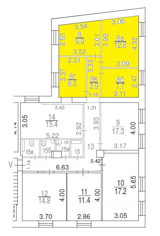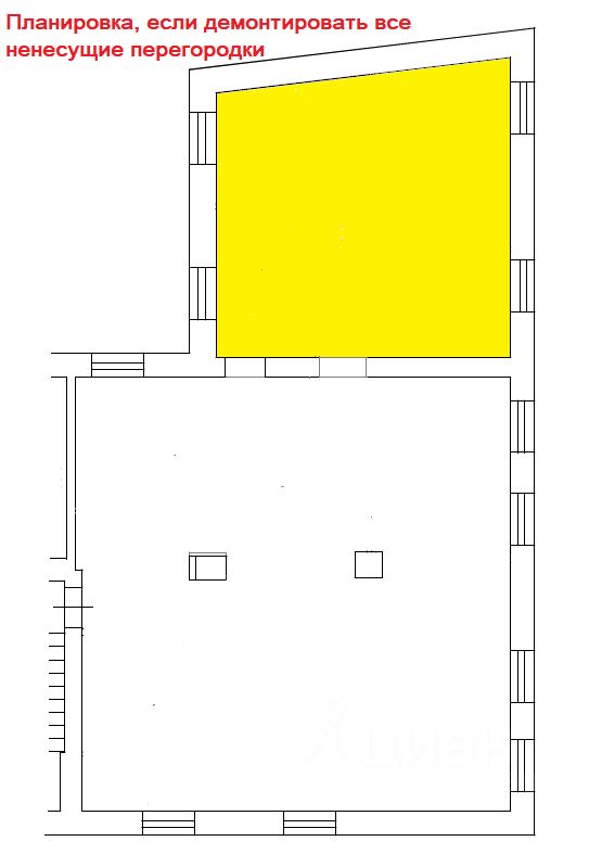 Помещение располагается на 3 этаже нежилого здания (на плане БТИ выделено желтым цветом).