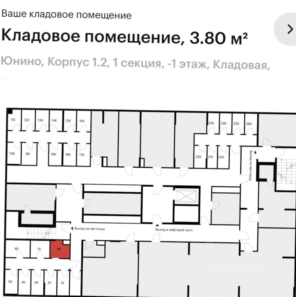 Продается кладовая в ЖК Юнино. Площадь 3.8 кв.м. Этаж -1.