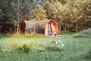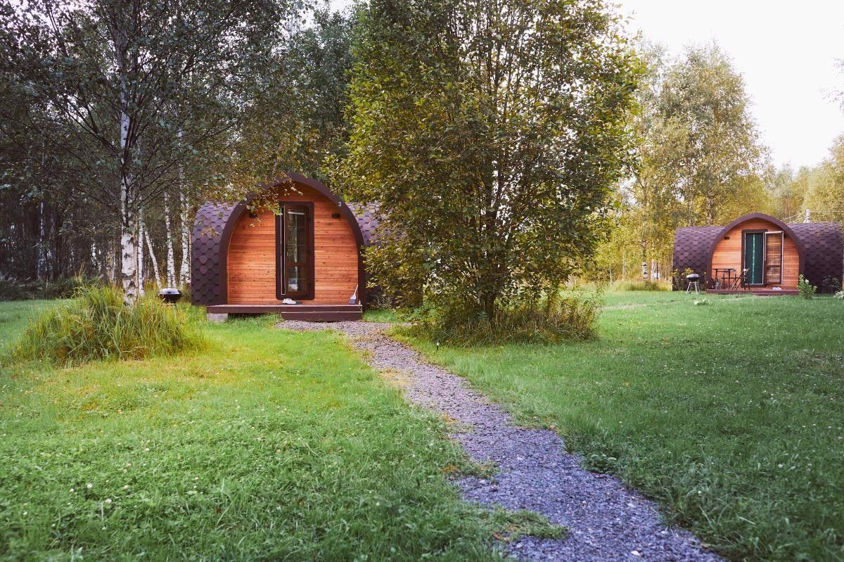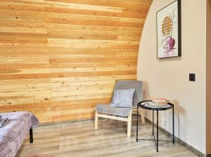У каждого домика своя деревянная терраса, позволяющая разместить раскладные столики со стульями. В вечернее время вход и террасу освещают бра, а светодиодный дюралайт на наружных стенах каждого домика непрерывно освещает территорию глэмпинга в темное время суток.