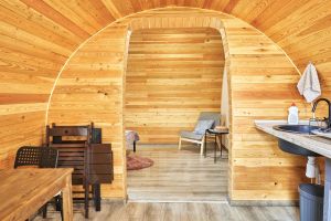 Для внутренней отделки каждого домика использована натуральная сибирская лиственница. Тепло в домиках обеспечивают инфракрасные регулируемые полы, а в зимнее время дополнительно устанавливаются электрические камины.