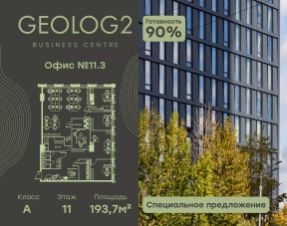 Продается офис в новом, концептуальном Бизнес-центре GEOLOG2. Бизнес-центр представляет собой отдельное офисное здание класса А: с просторным двухсветным лобби с панорамными окнами, бизнес-гостиной и подземной парковкой для резидентов. Расположен на Юго-Западе г. Москвы, в 7-ми минутах пешком от м. Калужская. Архитектурная концепция здания разработана Архитектурным бюро Blank Architects. В основу идеи заключен принцип тектонических сдвигов: смещения частей здания относительно друг друга, в результате чего архитектурный облик здания визуально разделяется на две, разные по объему и площади остекления, части.
