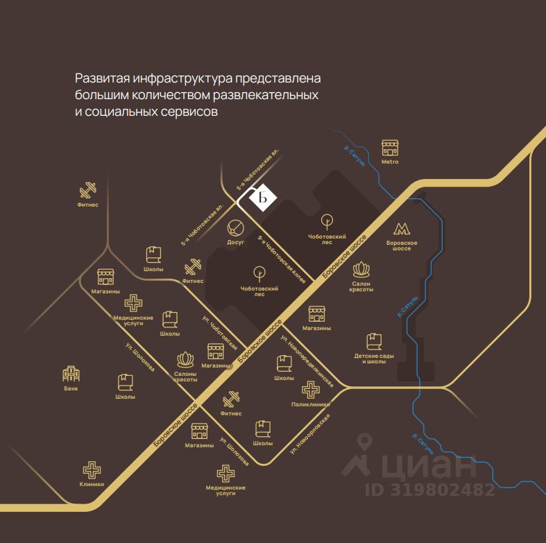 5 км от МКАДа по Боровскому ш. (рядом метро Боровское ш. и ст. МЦД Переделкино)