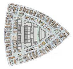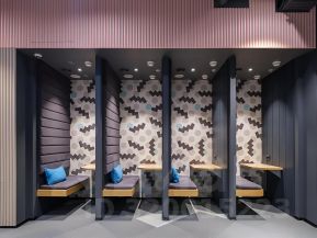 Планировкой предусмотрены кабинеты, общие рабочие зоны, переговорные, приватные скайповые кабины, зоны отдыха, кухни, серверные.