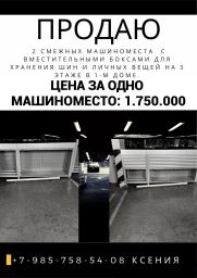 Продам 2 рядом стоящих машиноместа, на 3 этаже, цена за одно машиноместо - 1.750.000, при покупке сразу двух, будет скидка! На машиноместах установлены вместительные боксы, для хранения шин и личных вещей, боксы оснащены системой пожаротушения. Очень вместительные боксы, можете увидеть на фото, одно из мест возле стены,возле которой тоже можно поставить бокс в потолок, получится полноценная кладовая! Места под небольшим уклоном, за счет чего не скапливается грязь в межсезонье и зимой и все стекает на ровные места ))