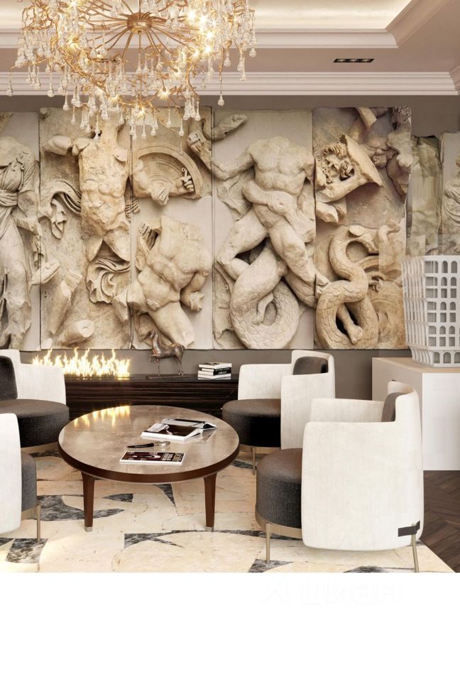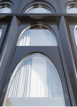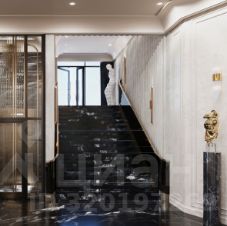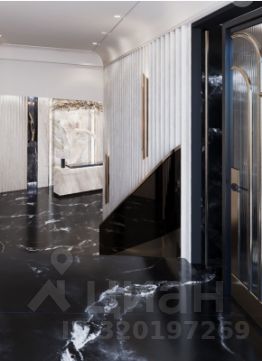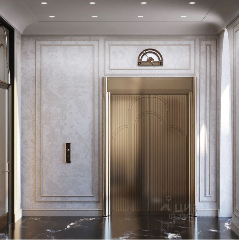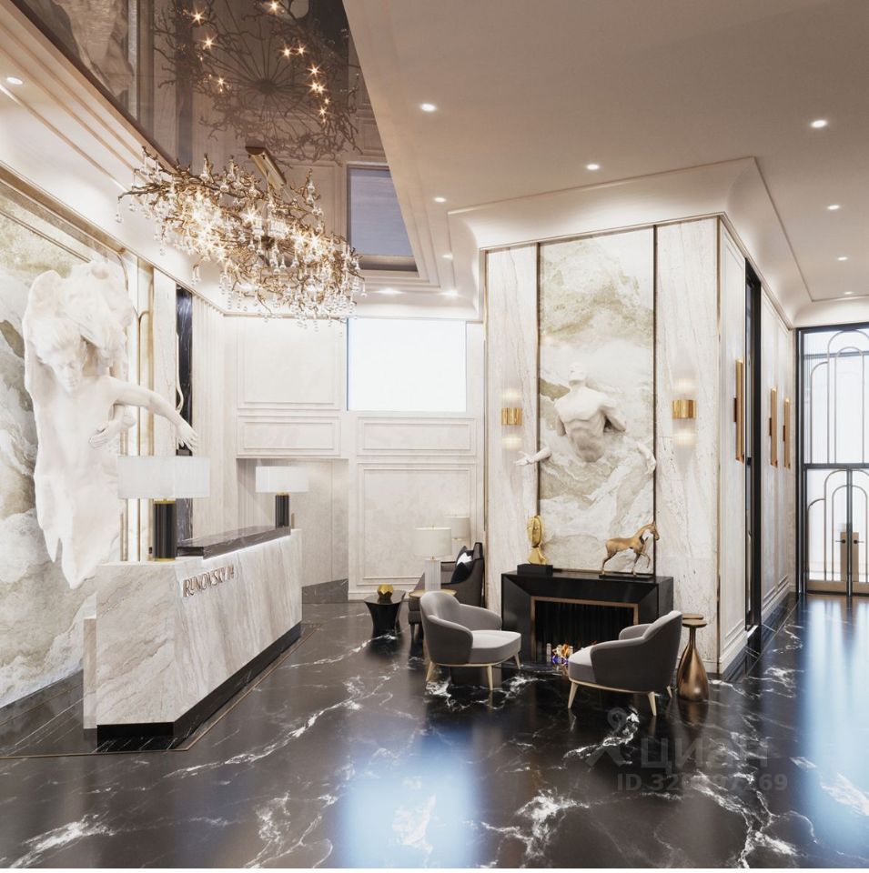 Лобби включает две 3-этажные секции, объединенные общей входной группой. Внутренний интерьер лобби также отражает премиальность проекта за счет сочетания контрастных оттенков латуни и натурального камня.