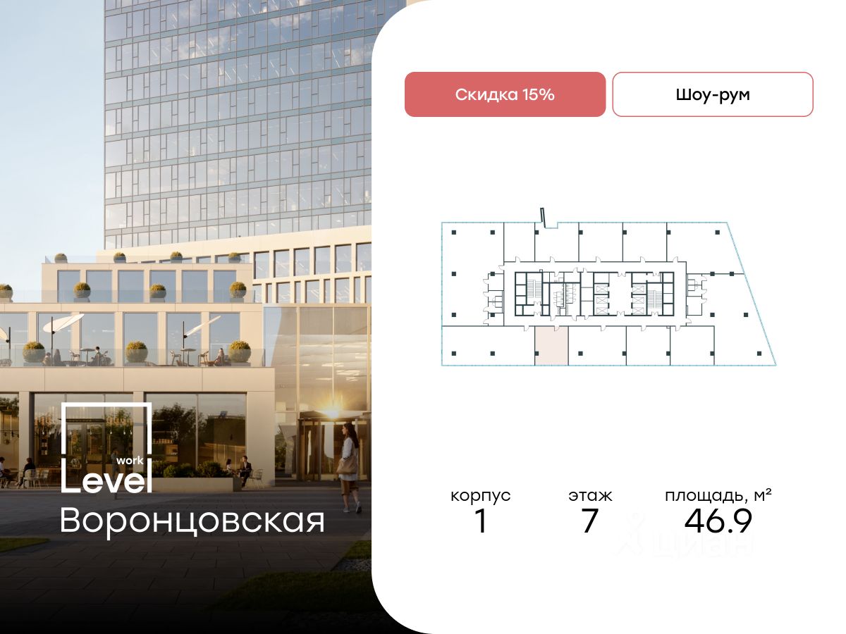 Цена указана с учётом скидки 15%. Выгодный актив: 50% средний рост стоимости за период строительства. На проекте полностью завершены монолитные работы. Возможность возврата ндс после покупки. Продаётся помещение площадью 46.90 кв. м в Level work Воронцовская (от компании Level Group), новом бизнес-центре класса A в престижном Обручевском районе Москвы (ЮЗАО). О проекте: - Отличная транспортная доступность: 6 минут пешком от метро Калужская, 1 минута пешком от станции БКЛ "Воронцовская" и 11 минут на автомобиле от ТТК; - 23 этажа и 149 офисов с разнообразными планировками; - Офисы площадью от 47 до 1357 кв. м. с возможностью объединения соседних лотов; - 7 лифтов скоростью 4 м/с в офисном блоке, включая сервисный; - Окна в пол и высокие потолки до 3,7 м; - Технологичный подземный паркинг на 179 машино-мест, включая места с зарядными станциями для электромобилей. Уникальная собственная инфраструктура: - Многофункциональный спортивный комплекс с теннисным кортом; - Фитнес-центр; - Фуд-холл и коворкинг; - Медицинский центр; - Торговый центр с супермаркетом. Благоустройство: - Озеленённая площадь у главного входа; - Пешеходные маршруты, повторяющие геометрию террас бизнес-центра; - Берёзовая роща для тихих прогулок; - Палисадники с уютными зонами отдыха. Окружение: - Воронцовский парк, Лес на реке Самородинке, Битцевский лес; - Усадьба Воронцово; - ТЦ "РИО Ленинский" и ТЦ "Калужский"; - Гастромаркет "Рынок на Ленинском"; - Офисы крупных нефтегазовых компаний и научно-исследовательские институты.