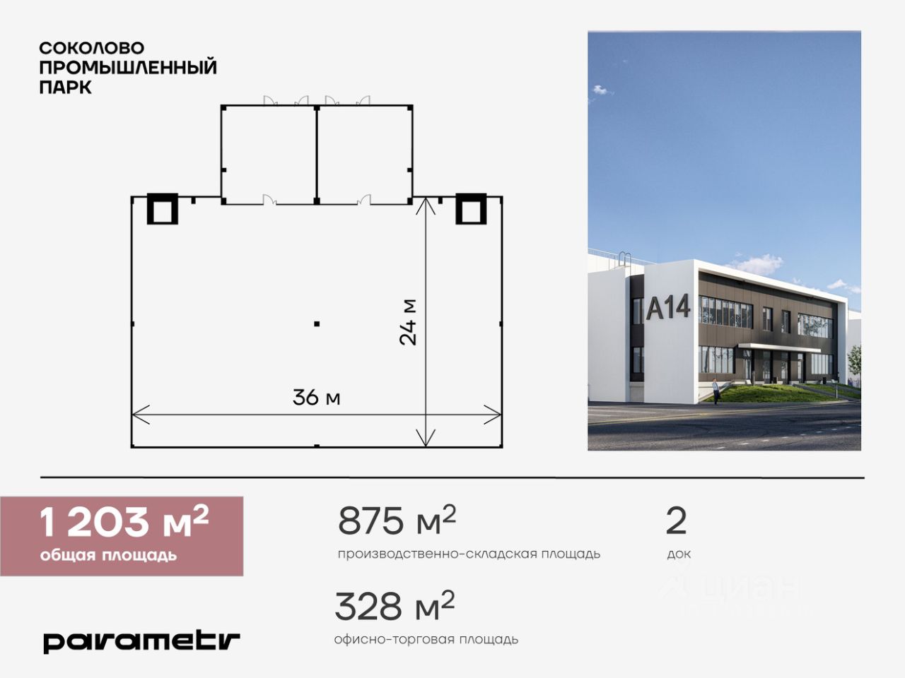 Помещение общей площадью от 1 034 м2 до 2 067 м2 состоит из универсального промышленно-складского блока и офисной части. Количество доков с докшелтером и выдвижным доклевеллером и количество ворот на нулевом уровне от земли зависит от площади помещения.
