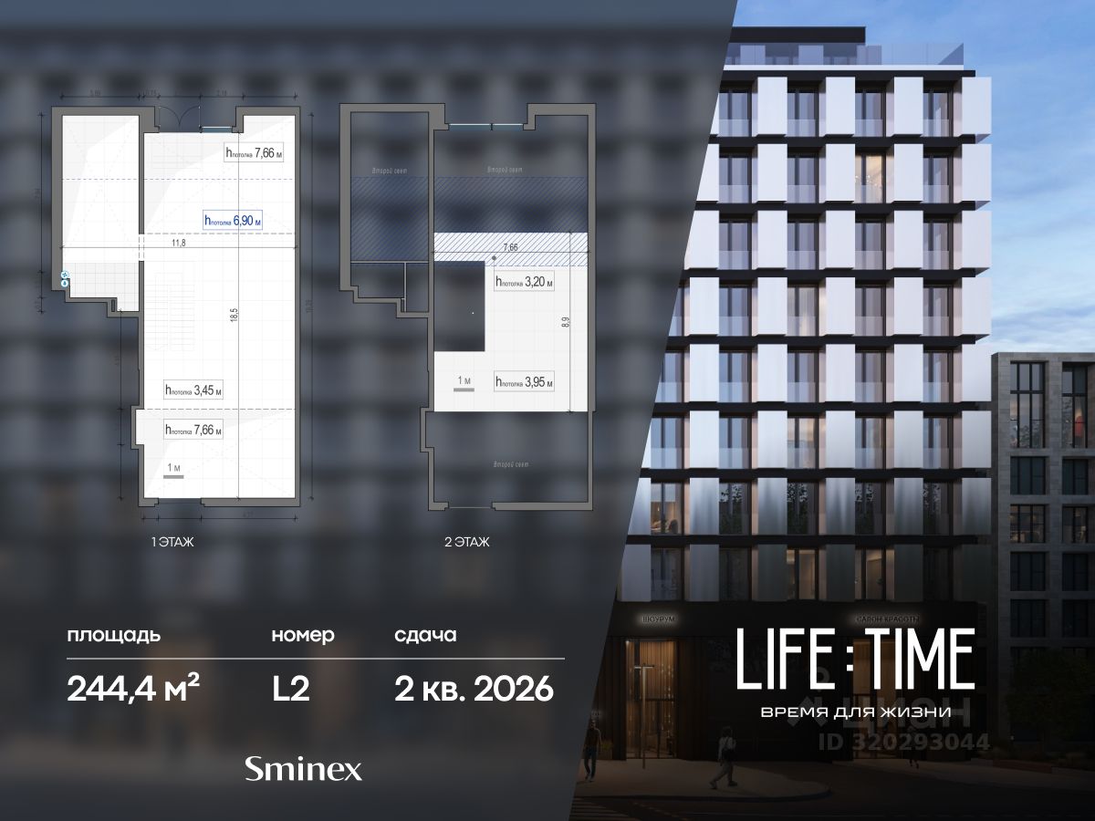 1 уровень - 187,8 кв. м с высотой потолка 3,45 м., 2 уровень - 56,6 кв. м. с высотой потолка 3,95 м.