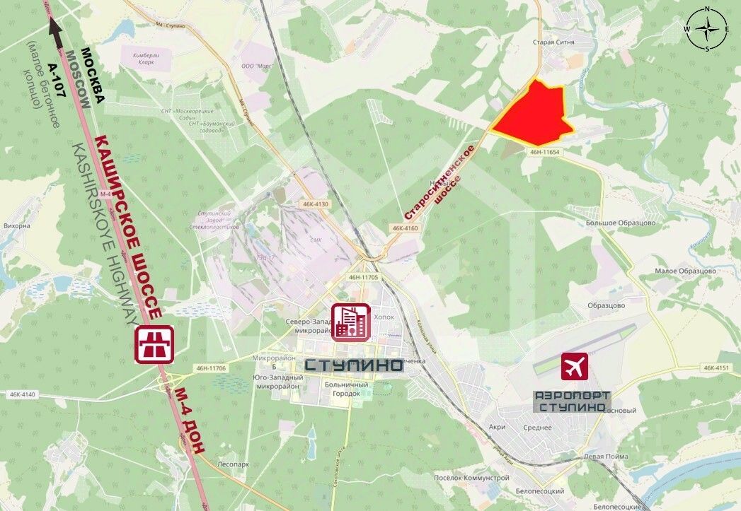 991612 . Земельный участок площадью 130,7 Га вблизи Ступино. 8 км от Каширского шоссе (М4 "Дон"), 77 км от МКАД. Широкие возможности использования. Из основных ВРИ возможно строительство: