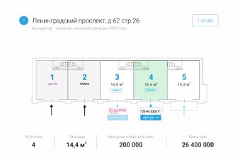 Помещение торгового назначения площадью от 14,4 до 14,5 кв.м на 1 этаже.