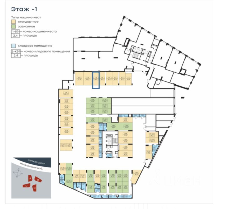 Продается комфортное просторное машиноместо (16,2 м2) на -1 этаже в ЖК Левел Нагатинская (место под номером 6; на схеме выделено синим). Удобное расположение между корпусами А и Б, недалеко от въезда, лучшее место в паркинге!
