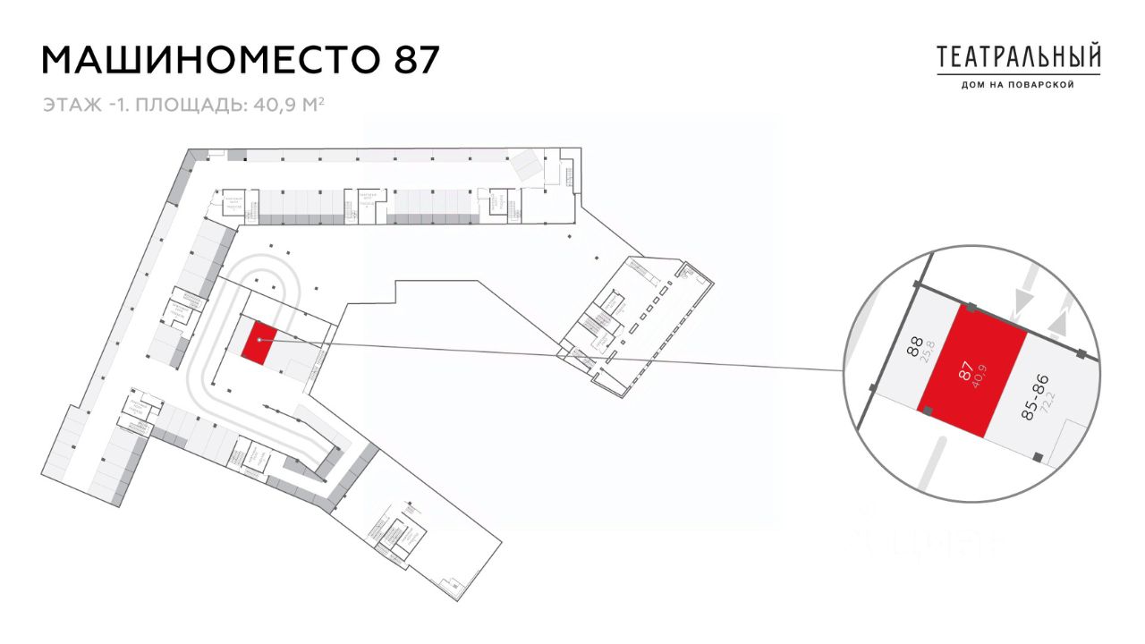 ГК "Галс-Девелопмент" предлагает к покупке машиноместо, площадью 40,9 м2. на -1 этаже в паркинге De Luxe квартала "Театральный дом" на Поварской улице, д. 8/1корп.1, района Арбат, г. Москва.