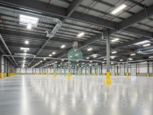 Ровный бетонный пол с антипылевым покрытием. Допустимая нагрузка на пол 6 т/м2.