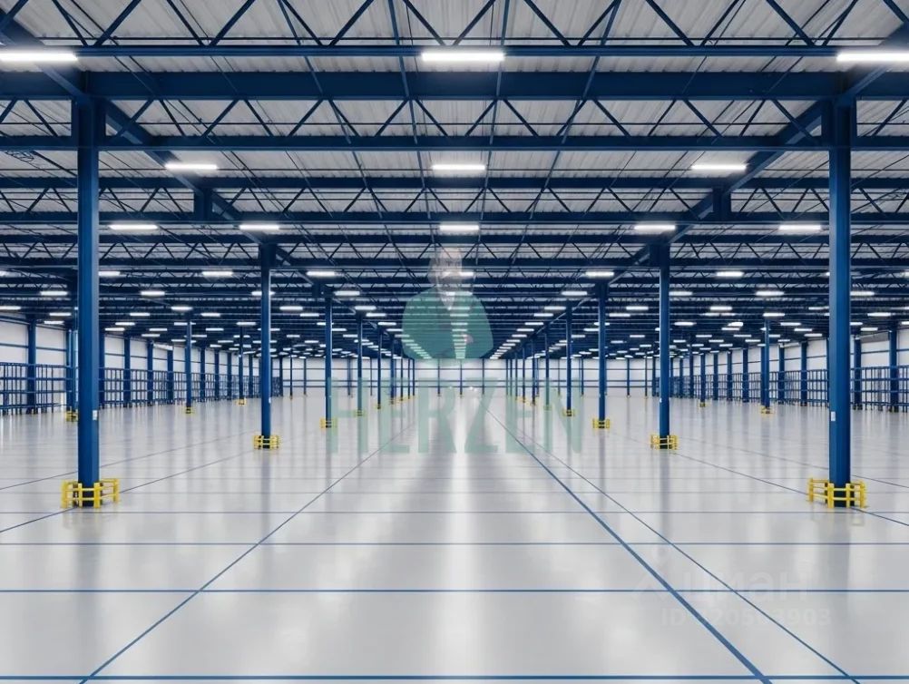 Ровный бетонный пол с антипылевым покрытием. Допустимая нагрузка на пол 6 т/м2.