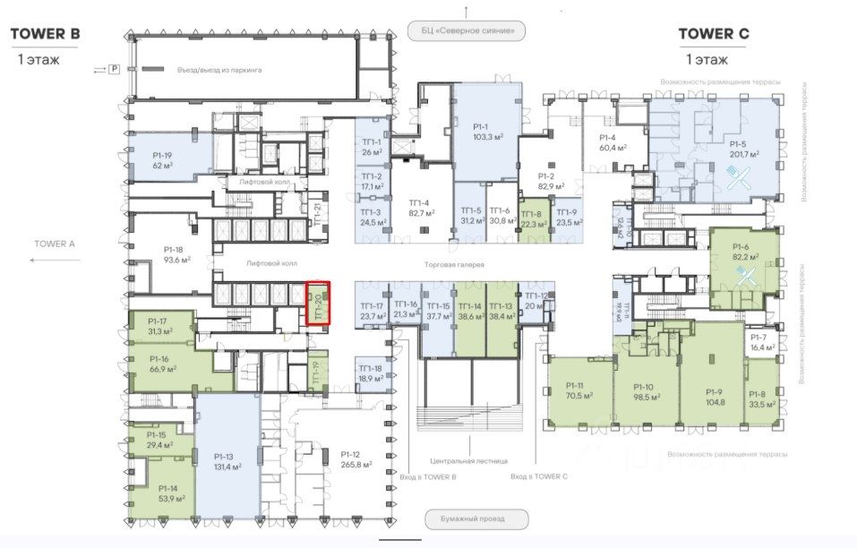 - Развитая инфраструктура: торговая галерея, офисные помещения, столовая для резидентов;