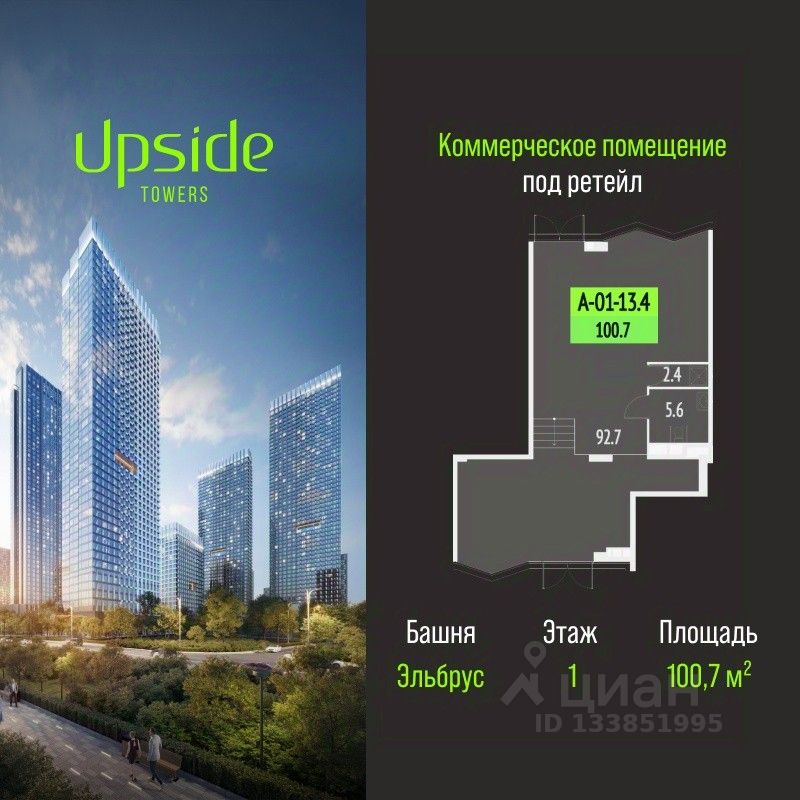 Уникальное коммерческое помещение под ретейл площадью 100.7 м² в сверхкварталеUpside Towers.
