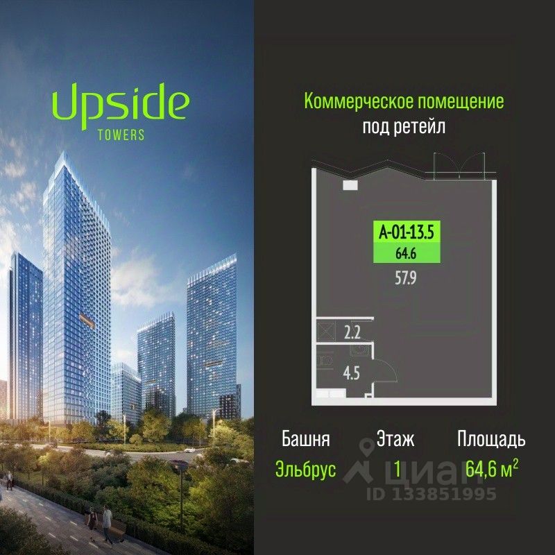 Уникальное коммерческое помещение под ретейл площадью 64.6 м² в сверхкварталеUpside Towers.