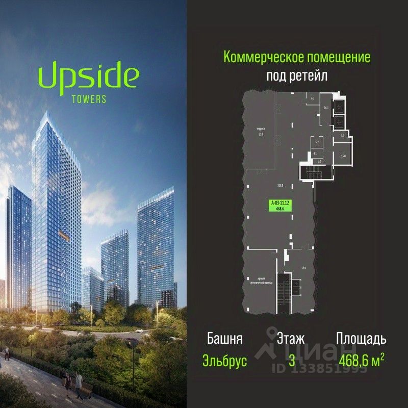 Уникальное коммерческое помещение под ретейл площадью 468.6 м² в сверхкварталеUpside Towers.