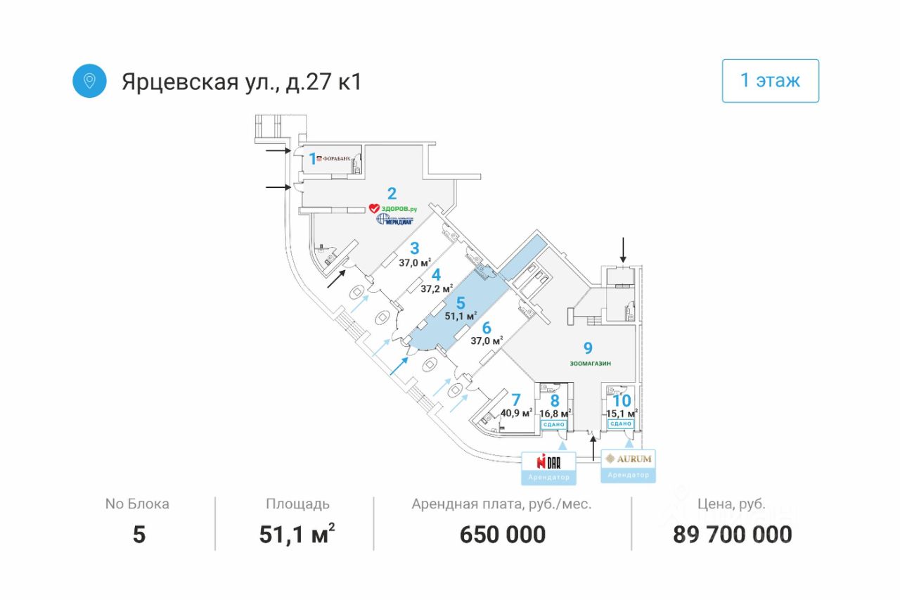 Продаётся готовый арендный бизнес! Помещение располагается на ул. Ярцевская д.27 корп.1 в шаговой доступности от метро "Молодежная" - менее 1 минуты пешком.