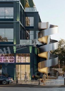 7 этажное здание выделяется фасадами изумрудных оттенков, спиралевидной лестницей, ведущей к террасам, а также, панорамными окнами и декоративными ламелями.
