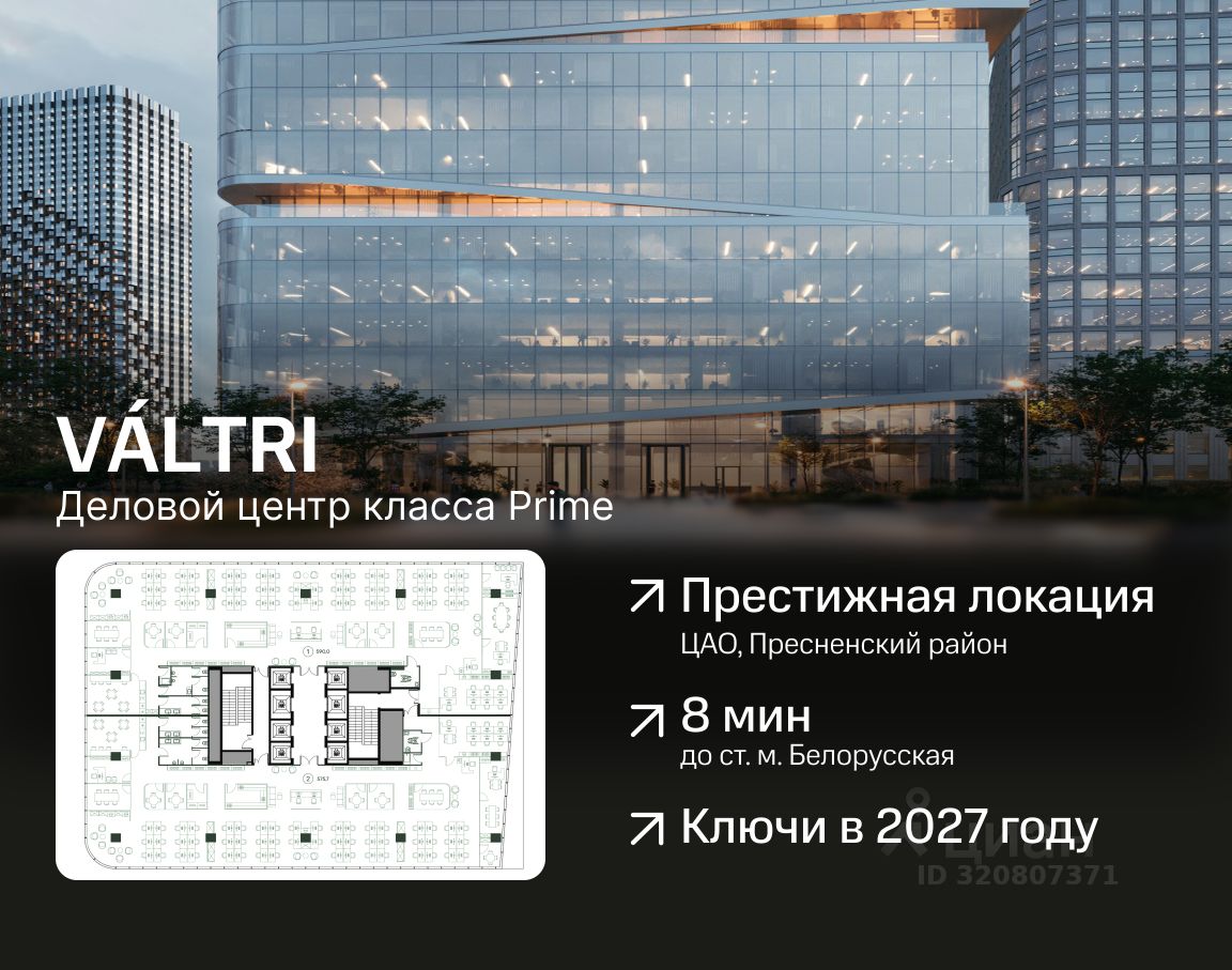 Бизнес-центр располагается в престижном районе Пресня — деловом сердце столицы. Инфраструктура локации закрывает личные и деловые потребности резидентов — вблизи делового центра находятся рестораны, кафе, аптеки, цветочный салон, гостиницы и др. Рядом удобные транспортные развязки и станция метро Белорусская. Инновационные архитектурные решения здесь органично сочетаются с инженерными. VALTRI — это деловой центр нового поколения, диктующий стиль.