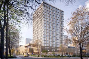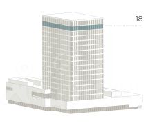 Комплекс включает офисные помещения с высокими потолками до 3,85 м, а также торговую зону с супермаркетом, магазинами, фуд-холлом, фитнесом и сервисами для резидентов.