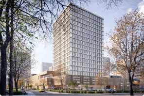 Комплекс включает офисные помещения с высокими потолками до 3,85 м, а также торговую зону с супермаркетом, магазинами, фуд-холлом, фитнесом и сервисами для резидентов.