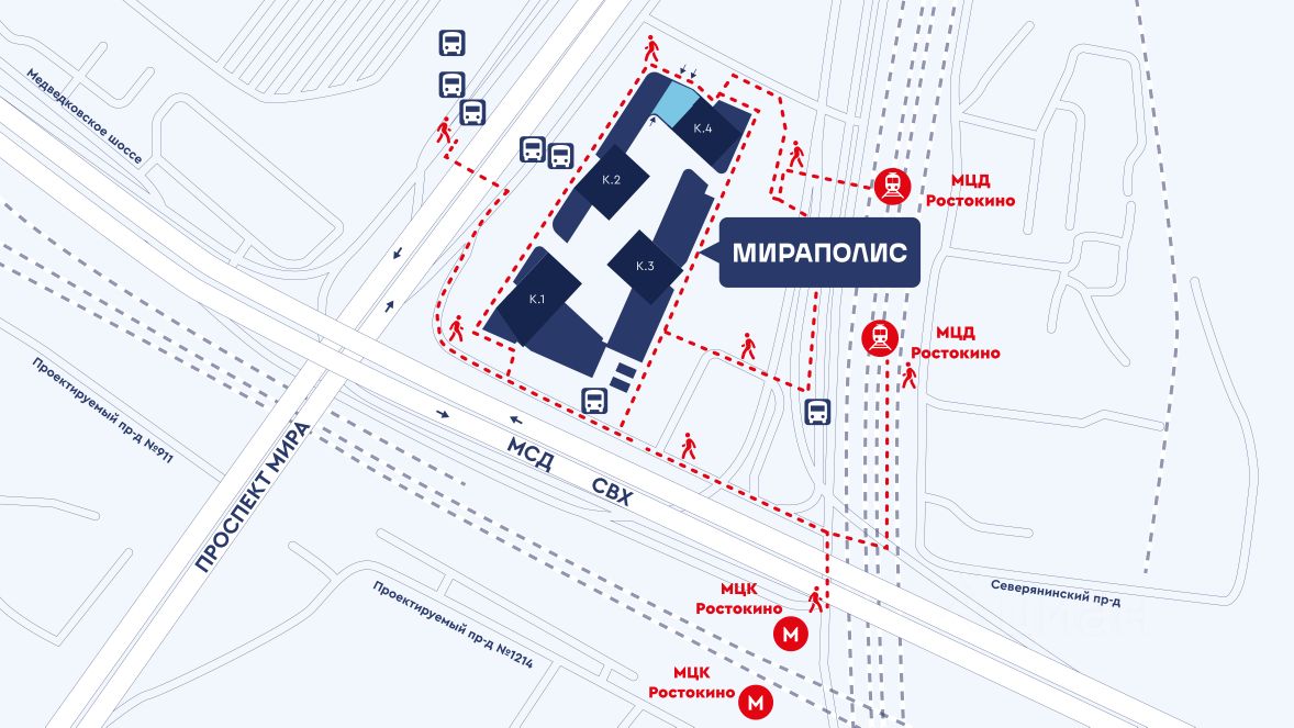МИРАПОЛИС состоит из 4-х небоскребов высотой 33-35 этажей. Расположен на проспекте Мира — крупной московской магистрали. По ней 8,2 км до Третьего транспортного и 11,5 км до Садового кольца. Рядом с кварталом проходит Московский скоростной диаметр (МСД).