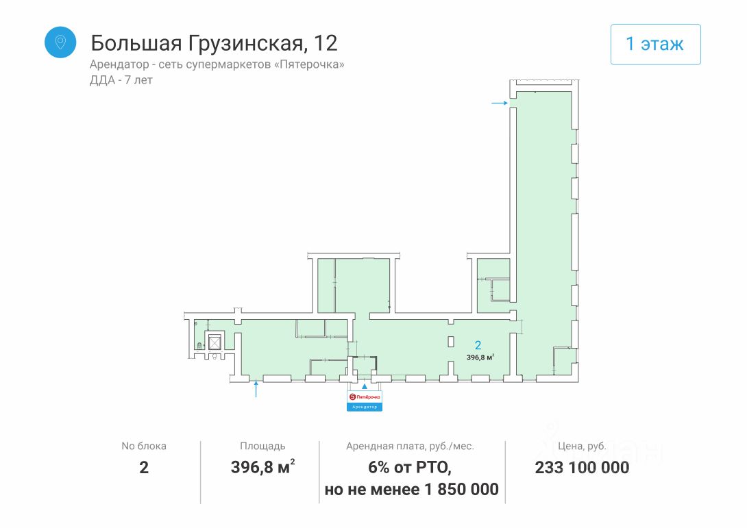 Долгосрочный договор аренды на 7 лет, арендная плата 6% от РТО, но не менее 1 850 000 рублей в месяц, коммунальные платежи и электричество оплачиваются арендатором отдельно. Схема сделки: договор купли-продажи недвижимости (ДКПН).
