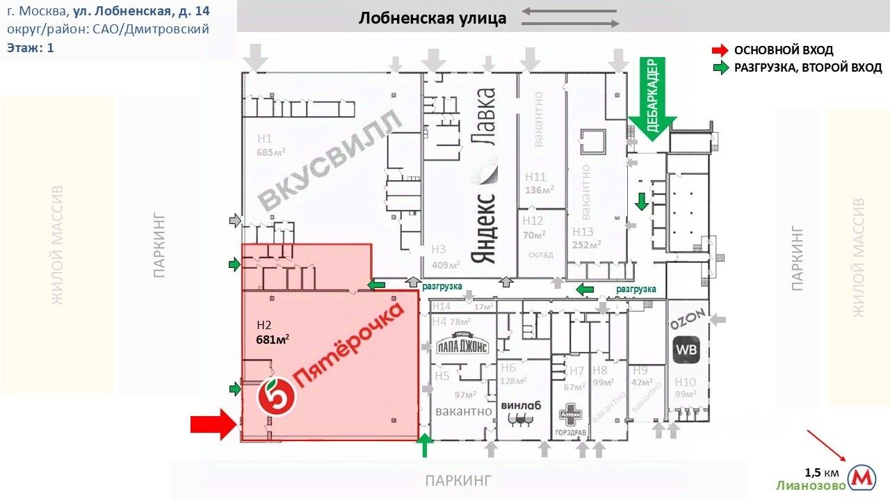 В здании расположены: Вкусвилл, Яндекс.Лавка, аптека Горздрав, пиццерия ПапаДжонс, WB, Ozon и многие другие магазины.