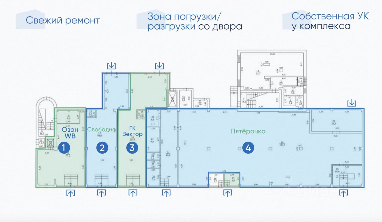 - 2 отдельных входа с улицы и один - со двора (для разгрузки/погрузки);