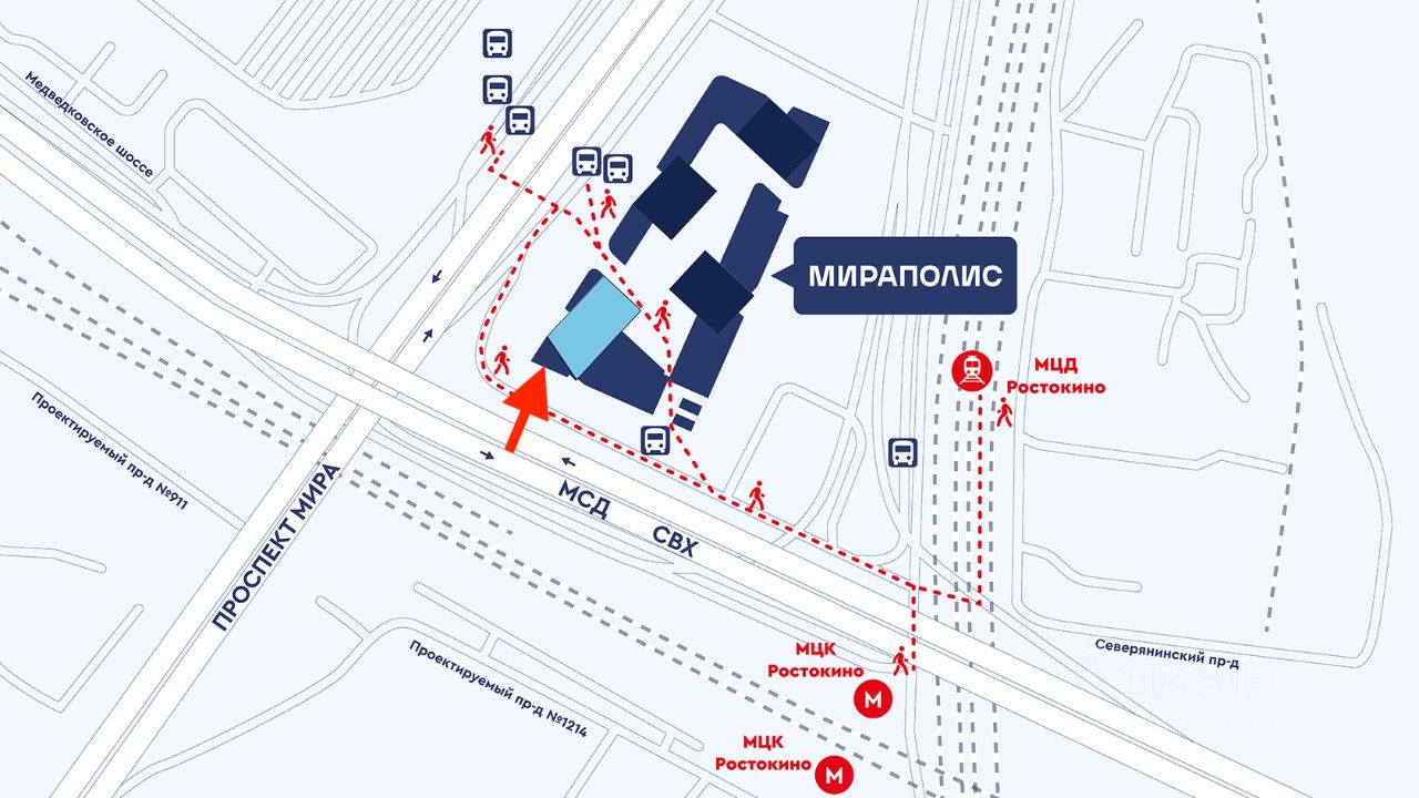 Комплекс Мираполис состоит из 4-х небоскребов высотой 33-35 этажей. Высокая проходимость благодаря пассажиропотоку ТПУ Ростокино. Количество резидентов комплекса составит свыше 5000 человек. Население в радиусе 1 км. составляет свыше 14 тыс. человек. Транспортная доступность: МЦК Ростокино - 6 мин. Пешкомм. ВДНХ - 5 мин. на автомобиле