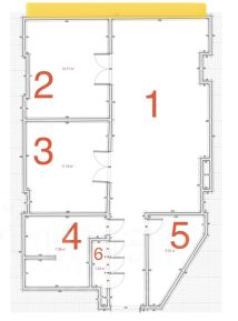 1,2 - кабинеты, 3 опен-спейс , две комнаты стеклянной перегородкой, 4 - санузел, 5- подсобное помещение или мини-кухня , 6- прихожая
