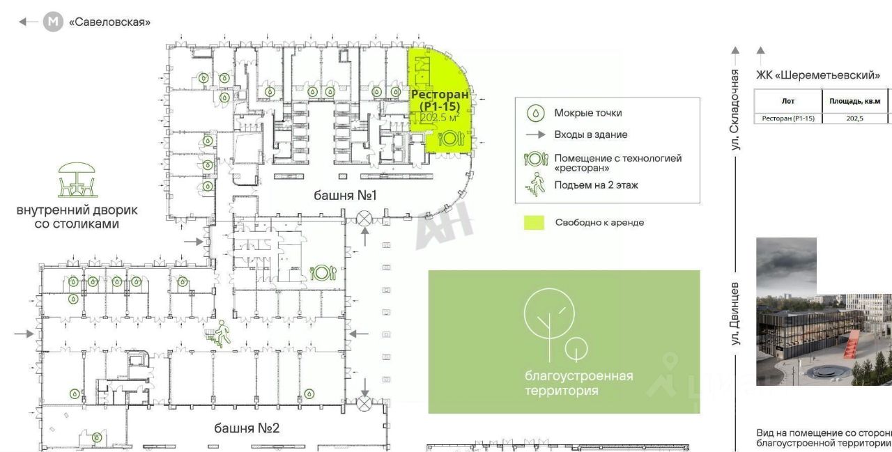 Лот 918087 Предложение от Собственника! Предлагаю в покупку последнее оставшееся помещение свободного назначения под общепит (ресторан, кафе), расположенное рядом с центральным входом, на 1 этаже общей площадью 202.5 м2, в 8 минутах пешком от м Савёловская.